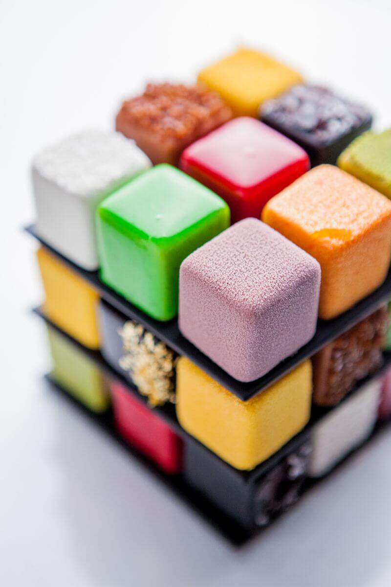 Grolet 也因其「甜點魔方」系列聞名。他在 2013 年首次創作出這種由 27 顆小蛋糕組成的方塊甜點,之後陸續推出許多令人驚豔的變體,每款都令人垂涎。