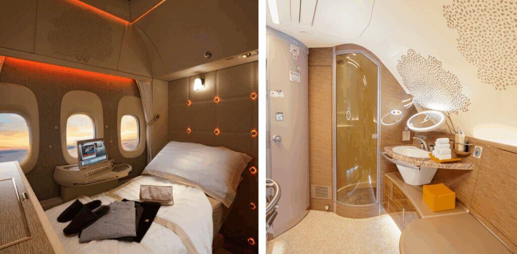 若選擇次一等級的 First Class Apartments,同樣可享受獨立休憩椅、可平躺大床、私人梳妝台、迷你吧,以及機上淋浴設施。每架僅 9 間公寓,堪稱空中最私密的豪宅。