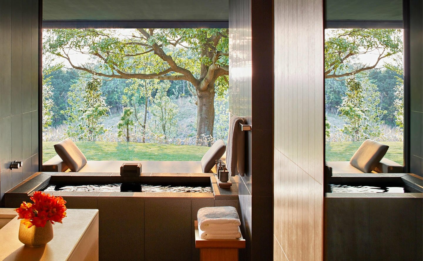 森之套房以當代手法演繹傳統日式旅館風格,特大床臥室和起居區合二為一,推開編織百葉拉門,戶外自然美景躍然眼前。賓客還可愜意享受私人日式溫泉浴池浸浴,引自附近溫泉的泉水飽含礦物營養,有助滋護身心,四周甯謐花園景觀環抱,怡神悅目。起居區與步入式衣帽間合二為一,配有懸掛式躺椅,營造出充足的放鬆空間。