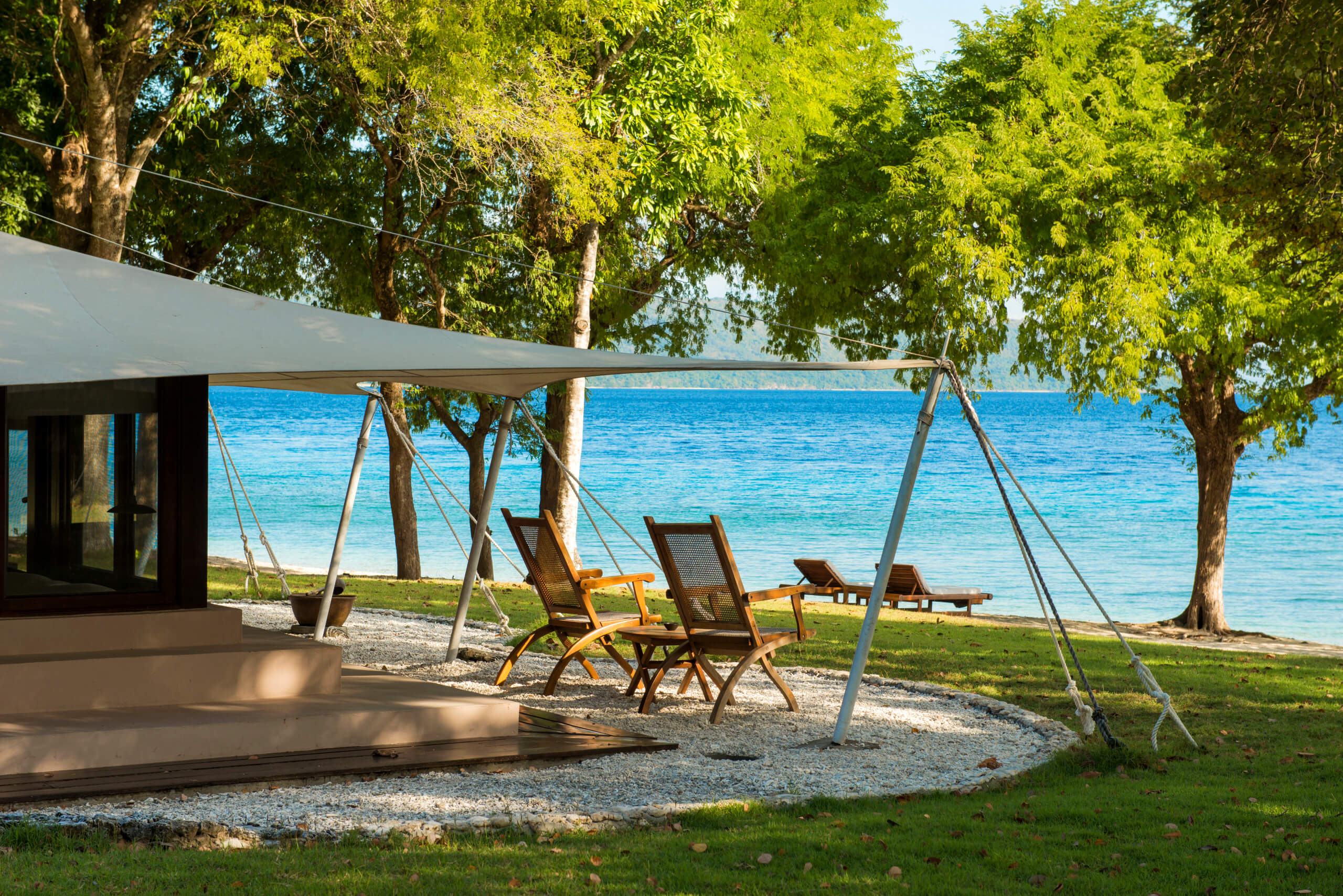 Amanwana(安縵灣瀾) 在寧靜的叢林環境中,被樹蔭支撐並位於熱帶樹冠下,每頂帳篷都提供了舒適的荒野體驗。大片窗戶呈現豐富的景色,而一張特大號床和大角沙發組成的寬敞客廳區域提供了豐富的休憩空間。