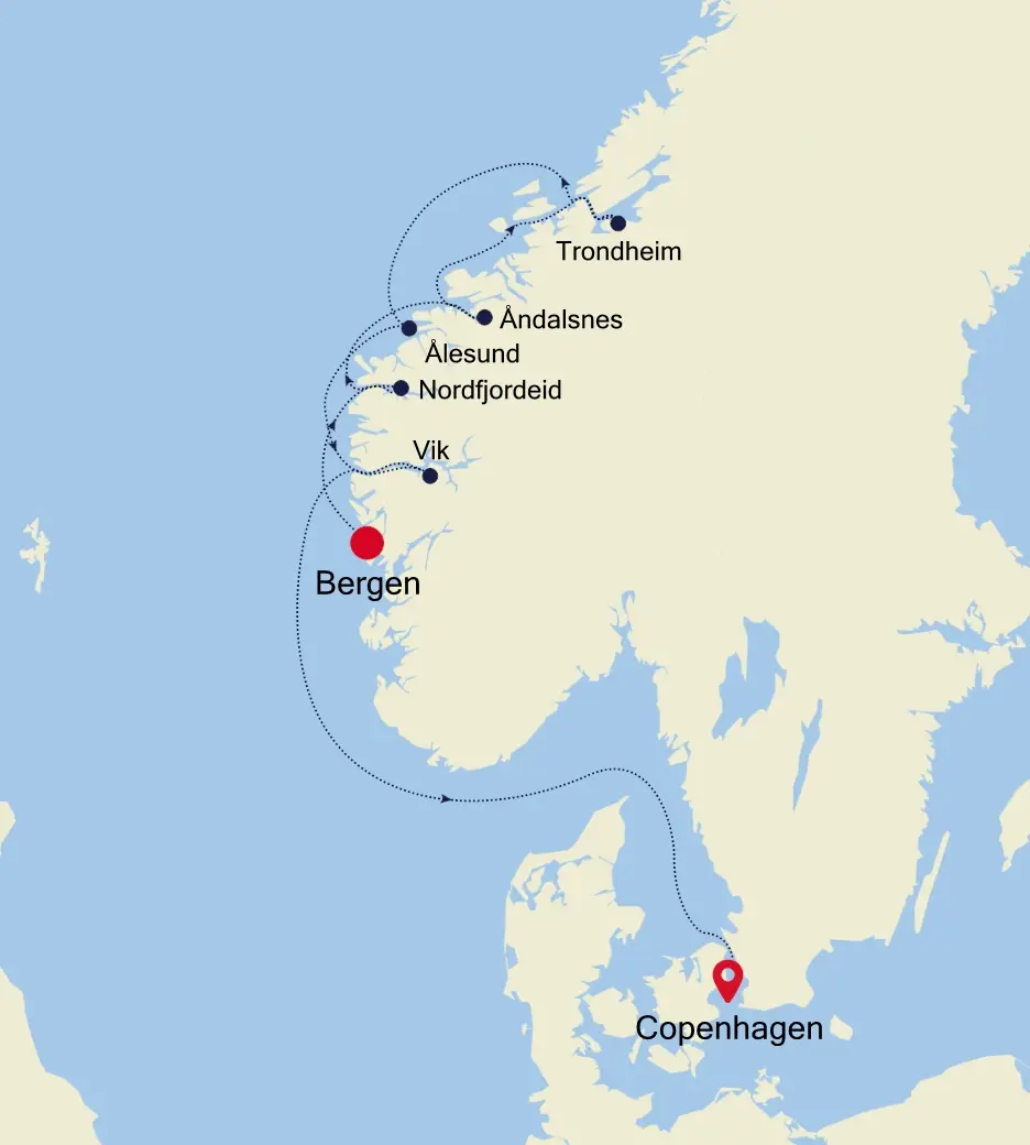 卑爾根的世界遺產海濱區,以斜立的粉彩倉庫迎接訪客。雖是挪威第二大城市,但依然保有溫馨的村莊氛圍。布呂根的五彩倉庫於1702年大火後重建,城市隨之擴展。倉庫後的小巷和木板路充滿手工藝店和畫廊。登上弗洛伊恩山可俯瞰全城美景,傍晚夕陽染金,城市燈火初上。附近的奈勒峽灣和松恩峽灣則展現了挪威最壯麗的自然風光。